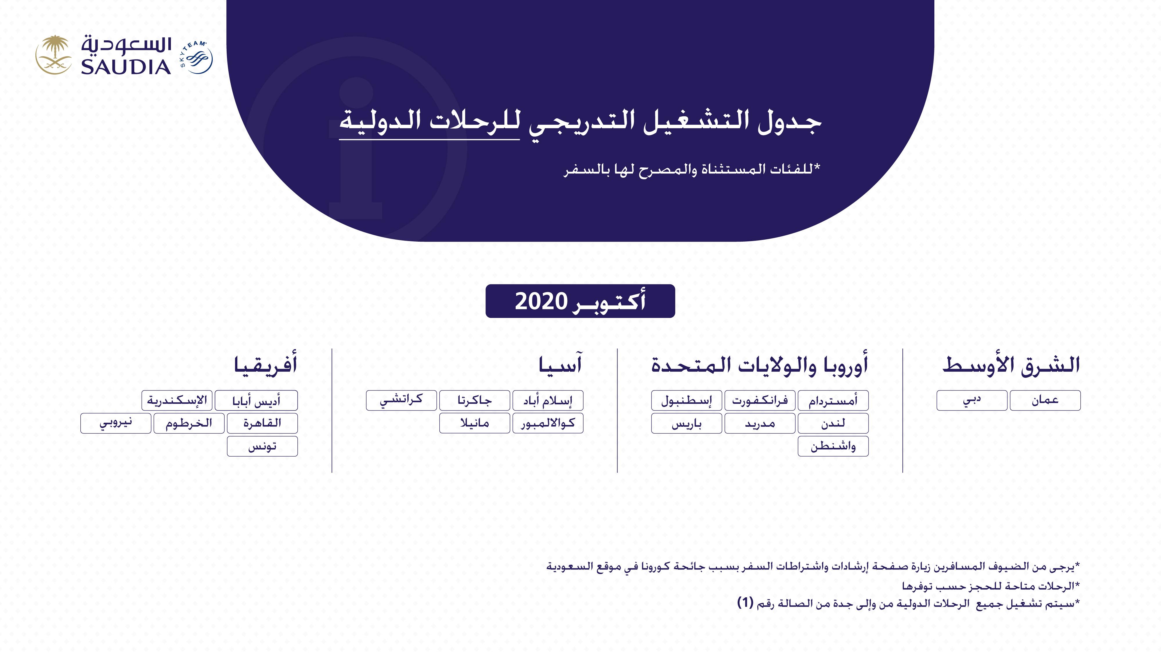 وأوضحت الخطوط السعودية أن الرحلات الدولية المتاحة خلال شهر أكتوبر الجاري موزعة على 7. كشفت شركة الخطوط الجوية السعودية عن جدول التشغيل التدريجي للرحلات الدولية. احصل على أفضل موعد لرحلتك واحجز من السعودية الى وجهتك المفضلة.