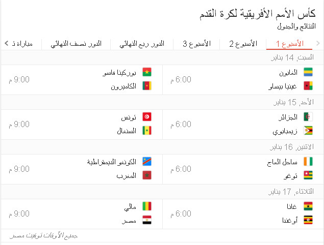 جدول مباريات الامم الافريقية 2017. حصلت شبكة قنوات بي إن سبورت الرياضية القطرية على حقوق نقل وإذاعة مباريات بطولة أمم أفريقيا 2017 حصريا على قنواتها لمنطقة الشرق الأوسط وشمال أفريقيا وسوف تذاع مباريات البطولة على قنوات bein max التي تم تخصيصا لنقل البطولة. كأس الامم الافريقية 2017 باجابون اعزائنا محبي ومشجعي كرة القدم ستنتلق بطولة الامم الافريقية 2017 في 14 يناير حتي 5 فبراير المقبل بدولة الجابون. أعلن الاتحاد الإفريقي لكرة القدم كاف عن جدول مباريات بطولة كأس الأمم الإفريقية 2019 والتي تستضيفها مصر في الفترة من 21 يونيو وحتى 19 يوليو المقبلين وذلك بعد سحب قرعة البطولة تحت سفح الأهرامات. جدول المباريات نشرت في.