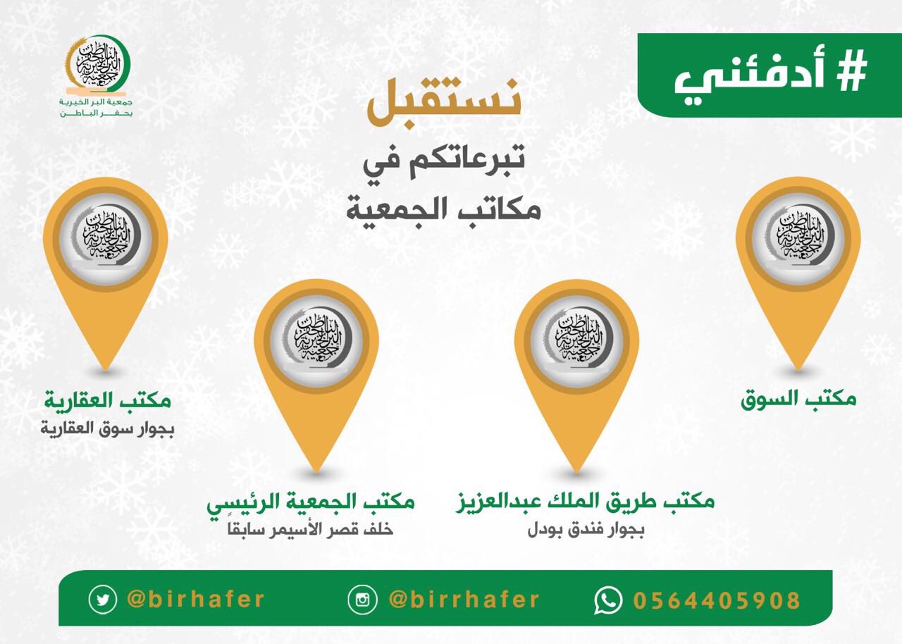 جمعية البر بـ حفر الباطن أنشئت في عام 1410هـ مسجلة بوزارة العمل والتنمية الاجتماعية برقم 110 بدعمك يستمر العطاء 0564405908 بر حفر الباطن.